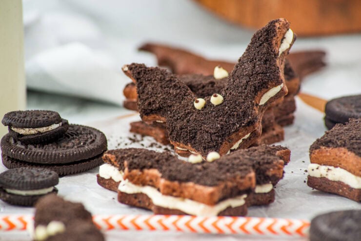 - Pipe the filling onto a plain bat cookie and top with an Oreo- sprinkled bat cookie.