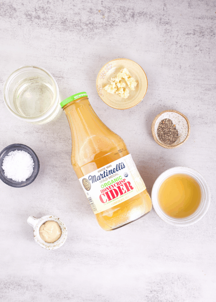 - Blend or whisk: Add the apple cider, apple cider vinegar, Dijon mustard, minced garlic, salt, and pepper into a small jar or bowl.