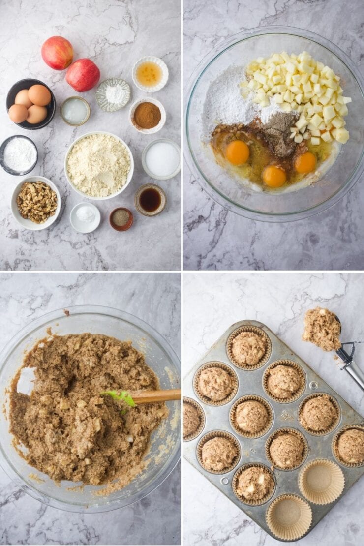 - Peel and grate apples on a box grater to obtain shredded apples, or dice them into small chunks.2. In a large mixing bowl, whisk together the wet ingredients: large eggs, honey, cup coconut oil (melted) or avocado oil, lemon juice, and teaspoon vanilla extract.3. In a separate bowl, combine the dry ingredients: cups almond flour, sea salt, cinnamon, baking powder, baking soda, arrowroot, and cardamom. Mix them well before folding into the wet mixture.4. Add in the chopped apples for moisture and flavor, then gently fold in the walnuts with a wooden spoon.5. Line a muffin pan with parchment paper, muffin liners, or paper liners. Scoop the muffin batter evenly into each muffin cup, filling about two-thirds of the way. If you like, place an apple slice on top of each muffin for presentation. 6. Bake at 350°F for 45 minutes until golden brown.