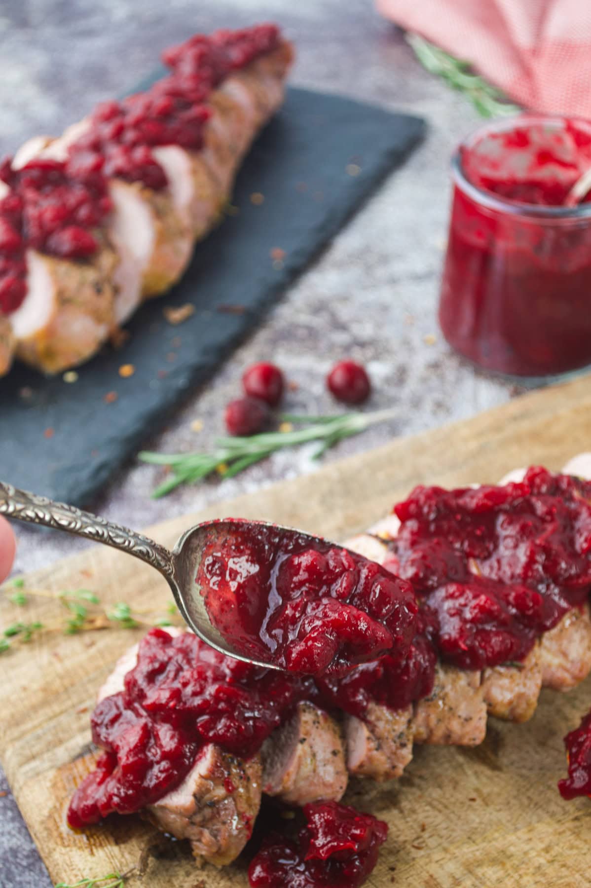 - Glaze: Spoon cranberry sauce over the pork, coating it generously.